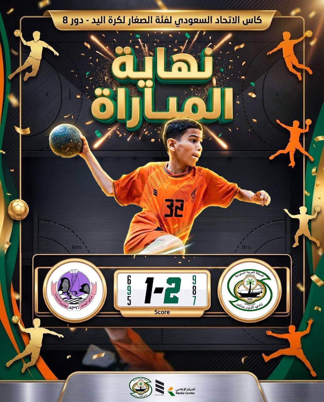 نتيجة نهاية المباراة لكأس الإتحاد السعودي لفئة الصغار لكرة اليد -دور ٨ نادي النور: ٢ نادي الهدى: ١