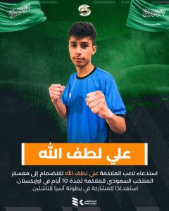 أستدعاء لاعب الملاكمة علي لطف الله للانضمام الى معسكر المنتخب السعودي للملاكمة لمدة ١٠ أيام في اوزبكستان استعدادً للمشاركة في بطولة آسيا للناشئين .