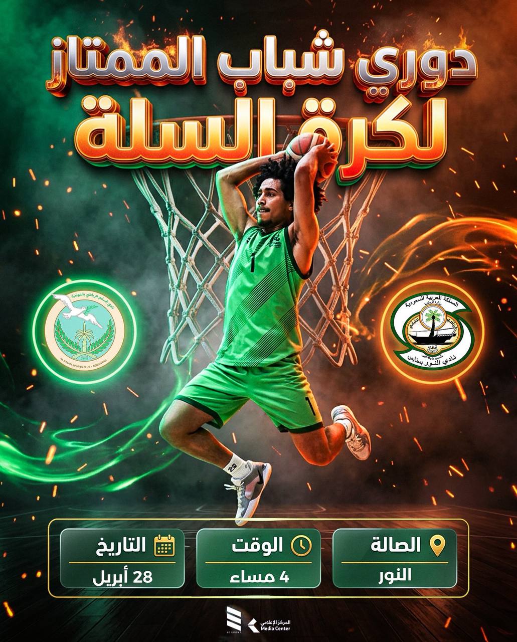 فريق شباب الممتاز لكرة السلة بنادي النور في لقاء مع السلام يوم الثلاثاء ٢٨ أبريل في تمام الساعة الرابعة مساءً في صالة النور.
